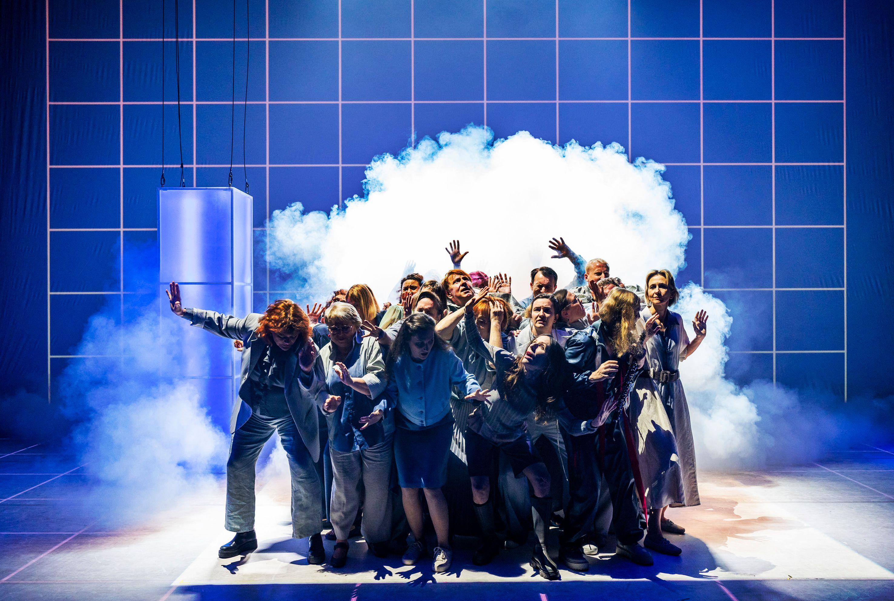 ‘Mit 30 fängt das Leben an.’, heißt es immer. Dass man dann endlich, nach den orientierungslosen Eskapaden der 20er, weiß wo man hingehört, dass das Suchen ein Ende hat. In “Geschichten vom Ankommen, Weggehen, Bleiben” stehen eben jene Erwachsenen auf der Bühne und erzählen eine ganz andere Realität. Sie befinden sich in einer Art Bahnhofshalle, einem liminalen Raum, unklar, wo er anfängt oder aufhört, umgeben von geometrischen Formen, einem Raster, aus gleichgroßen, leeren Quadraten.
